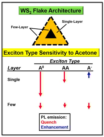 Figure 10 is a model to summarize the single- and few-layer WS2 exciton PL emission behavior in the presence of acetone. Acetone causes an overall decrease in the A0 and AA exciton band PL emission for single- and few-layer WS2. A decrease in PL emission was also produced in the A exciton band PL emission in few-layer WS2, but there is an overall increase in the A exciton band PL emission from single-layer WS2.