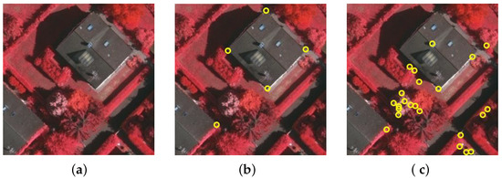 The problem to be solved in the present work: building corners in aerial images are hard to identify with existing generic corner detectors. (a) An aerial image for testing. (b) The ground-truth corner points (manually labeled). (c) Performance of a recently-proposed corner detection algorithm, the WEAE [].