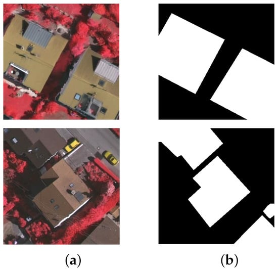 In our work, the building regions are focused on, and therefore the surface categories defined in our dataset only include buildings and background. In addition, for a fast implementation of our developed algorithm, we only pay attention to the common aerial image data and abandon the additional DSM information. As a result, a new dataset, without DSM, is generated by marking out building areas from background only. Similar to [], we further split these 16 newly-produced images with labeled ground truth into training (including #1, #3, #5, #7, #13, #15, #17, #21, #23, #26, #28, #32, and #34) and testing images (including #11, #30, and #37). We randomly sample 150 patches of 321 × 321 pixels from each training image, and we conduct data augmentation including image flipping and rotation of 90 degrees, 180 degrees and 270 degrees. In total, 11,700 new and smaller training images are therefore obtained to determine the FCN parameters which have been pre-trained on MS-COCO []. In the same way, 450 images are also produced for testing. Figure 2 shows two example images as well as the ground-truth segmentation results for our developed dataset.