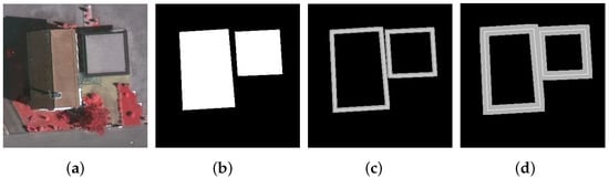 To overcome the difficulty mentioned above, the existing CNN models usually employ a weighted loss function to keep a balance between background and edges. The Richer Convolutional Features (RCF) [], a typical network of edge detection, is therefore exploited as the basic network for building contour detection. In our training process, the resolution of every input image is 321 × 321, and all the other network parameter settings are taken to be the default values of the RCF. Since each edge map produced from the RCF is in a probability format, a standard non-maximum suppression (NMS) is used to transform these into a binary ones for conducting the follow-up corner detection step.