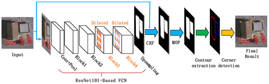 - Building region segmentation. With the trained DeepLab model, a building region segmentation of the input image is conducted using the FCNs (a ResNet-101 re-purposed by atrous convolution), followed by the exploitation of a CRF step and the morphological opening operation (MOP) to improve segmentation accuracy.