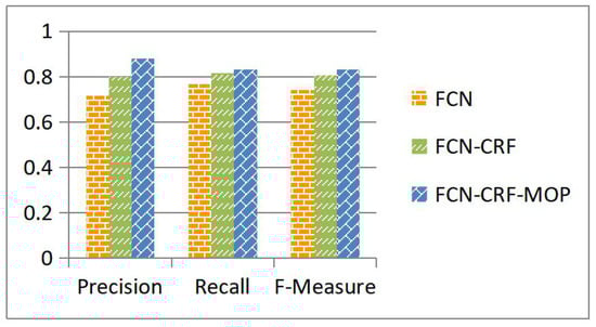 Our algorithm is developed upon an effective building segmentation approach, i.e., the FCN-CRF-MOP model as proposed and discussed in Section 3.2. This model is of crucial importance for the final building corner detection. For verification, corner detection is conducted on the segmentation results produced with the existing FCN and FCN-CRF models and our proposed FCN-CRF-MOP model individually. Figure 7 shows a performance comparison of the three segmentation models with respect to the precision, recall, and F-measure of the detected corners. While it has been shown in Section 3.2 that the FCN-CRF-MOP model improves the segmentation accuracy of building regions, one can see from Figure 7 that this model also helps to generate better corner detection performance when compared with the FCN and FCN-CRF models.