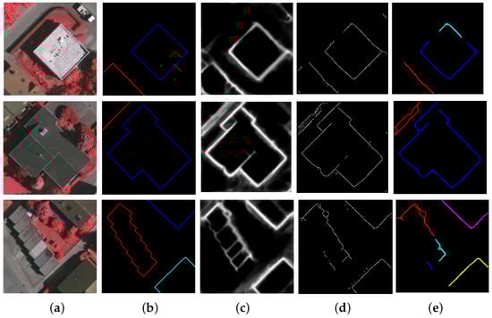 Building contour extraction in aerial images using the Richer Convolutional Features (RCF) []. (a) Test images; (b) ground-truth building contour curves; (c) RCF edge probability map; (d) RCF binary edge map; (e) Final results of the RCF.