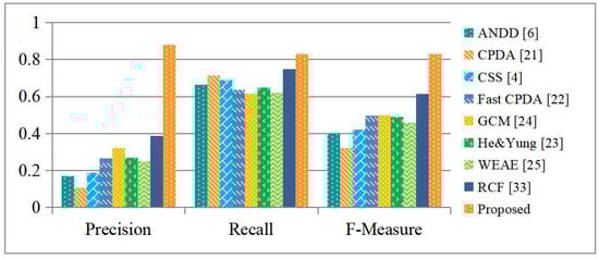 Figure 9 shows the evaluation results. It is observed that the existing corner detectors all have rather high recall rates, indicating that they are able to detect most of the building corner points. Unfortunately, their precision rates are all remarkably low, indicating that a lot of false positives are generated. As a result, they all have low F-measure values. Our proposed detector generates much fewer false positives and more true positives simultaneously. In consequence, it delivers the best results in terms of all of the evaluation metrics and outperforms the existing detectors, as well as the reference one, by a large margin.