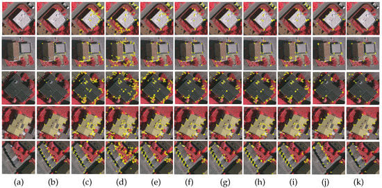 Ten images are selected for testing from our developed dataset of aerial images, as shown in Figure 10a. These images contain rich building corner information, as well as a large number of disturbances generated by trees and shadows. For an objective evaluation, we manually annotated the ground-truth corners on each test image (highlighted by yellow squares, as shown in Figure 10b).