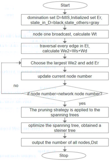 The algorithm of Steiner tree construction aims to connect the obtained MIS by adding Steiner nodes to construct a Steiner tree, finally, the set of all nodes obtained by the Steiner tree is CDS. In this section, two algorithms, IK–ST and ML-ST are proposed, and the following two algorithms are introduced in detail. Figure 5 and Figure 6 are the flow chart of IK–ST algorithm and ML-ST algorithm, respectively.