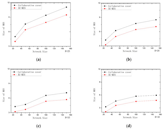 Performance comparison of IC-MIS with Collaborative coverage: (a) R = 25; (b) R = 30; (c) R = 35; (d) R = 40.