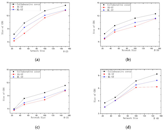 Performance comparison of IK–ST, ML-ST with Collaborative coverage: (a) R = 25; (b) R = 30; (c) R = 35; (d) R = 40.