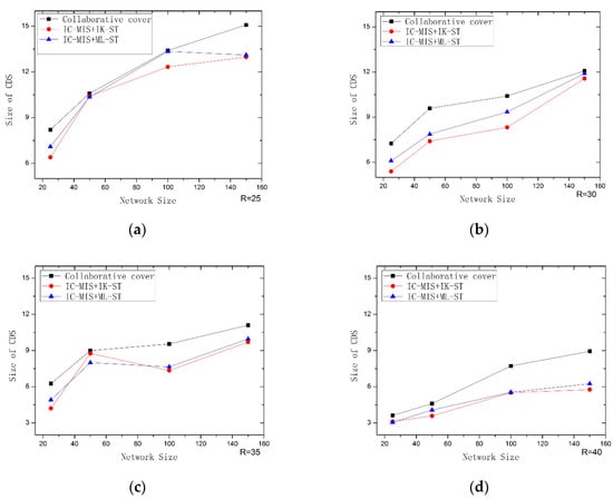 Performance comparison of IC-MIS+IK–ST, IC-MIS+ML-ST with Collaborative coverage: (a) R = 25; (b) R = 30; (c) R = 35; (d) R = 40.