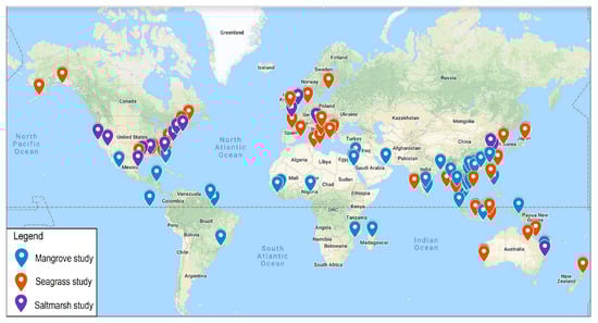 From Figure 4, it can be seen that the mangrove studies have been conducted all over the world, whereas the study sites of the seagrass are located mostly in South Asia and Europe. The study sites of salt marshes are located mainly in the USA, Canada, and Europe.
