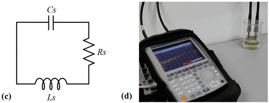 (a) Schematic of the proposed sensor device. (b) Picture of the sensor device immersed in the material under test (MUT). (c) Equivalent electrical circuit of the proposed SRR. (d) Sensor’s dipoles connected to the analyzer.