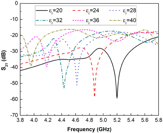 Simulated results of the transmission response (S21) when the dielectric permittivity is changed from 20 to 40.