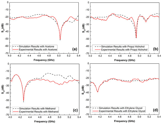 Simulated and experimental results obtained for (a) Acetone (ε = 20.7), (b) propyl alcohol (ε = 21.8), (c) methanol (ε = 33.1) and (d) ethylene glycol (ε = 37).