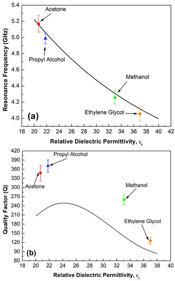 Finally, the quality factor of the proposed structured was evaluated in each case. Figure 4b shows a comparison between the obtained theoretical and experimental results. The theoretical model shows that a maximum quality factor of 252 is obtained when the dielectric permittivity of the surrounding medium is close to 24 and it decreases strongly to 84 by samples whose is near to 38 as was predicted by the theoretical model. The experimental results show the same trend observed in the theoretical model. The experimental results show a same trend that the theoretical model, which validate the response of this sensor. However, as it is evident from the results illustrated in Figure 3, the Full Width at Half Maximum (FHWM) in experimental results is lower than theoretical results, for this reason, we obtain a higher quality factor with the experimental data. A mean quality factor of 347.677, 370.834, 259.967 and 125.438 were obtain experimentally for acetone, propyl alcohol, methanol and ethylene glycol respectively. Thus, the equation that describe the behavior of the Q-factor of the proposed sensor is can be expressed as: