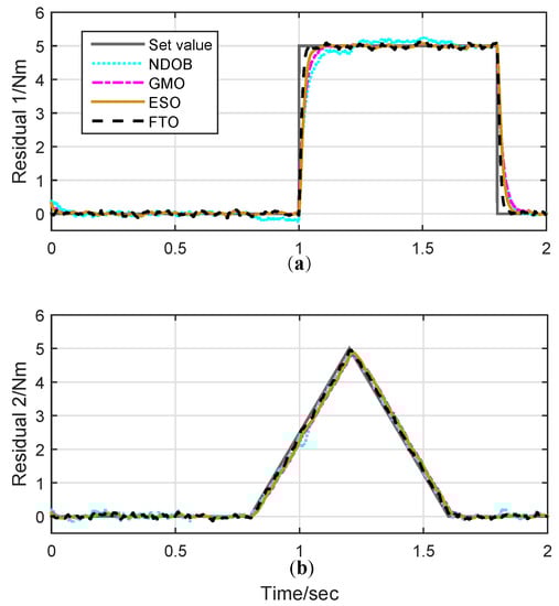 The disturbance observer technique has been widely utilized in robotic manipulators for a variety of purposes. The basic idea of DOB is to use the robot motion state and joint torque as input and then to estimate all the unknown internal and external torque imposed on the manipulator in a lumped term as the output. In Reference [5], a nonlinear disturbance observer (NDOB) was established to estimate the rapidly varying friction by elaborately choosing a nonlinear function. However, the selection of such a nonlinear function is nontrivial, and the implementation of this NDOB is limited to a two link condition. By observing the generalized momentum, the generalized momentum observer (GMO) [9] is built, which not only can avoid the calculation of acceleration to decrease the influence of noise in position measurement but also can generate the observation of disturbances as a first-order filtered result of the true value. GMO is able to realize FDI such as the prediction of the accidental impact as well as the saturated actuator fault [9]. Its easy implementation and reliable performance make GMO a popular and widely used method in many robotic applications [6,8,12]. However, in practice, GMO has to make a trade-off between the response rate and noise filtering. In a sensorless scenario, GMO is designed to remove the noise in a motor current as much as possible but at the cost of a delayed response. Such delayed behavior will degrade the detection sensitivity and response rate when GMO is applied in collision detection. As an enhancement of GMO, an external state observer (ESO) was proposed in Reference [10] by taking the disturbance as an external state. Moreover, despite the fact that many DOBs have been developed for robotic manipulators [5,9,10,13,14], the asymptotic convergence rate of these DOBs reveals that the estimation error will not converge to a certain small level quickly and will never decay to zero.