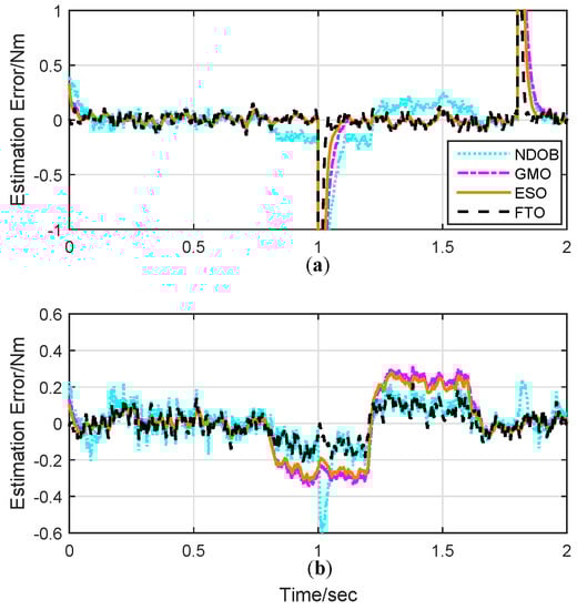 The disturbance estimation errors of external torque. (a) External disturbance estimation errors for joint 1; (b) external disturbance estimation errors for joint 2.