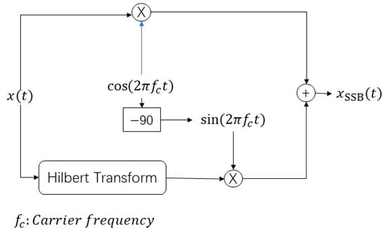 In general, the single-sideband (SSB) [] is extracted from the double sideband (DSB) which contains two sidebands: the upper sideband (USB) and lower sideband (LSB). Both contain the complete information of the original baseband signal. The SSB modulation only requires half of the signal bandwidth. In Figure 1, without loss of generality, let be the baseband signal, then the mathematical model of two sidebands USB and LSB in the time domain can be expressed as: