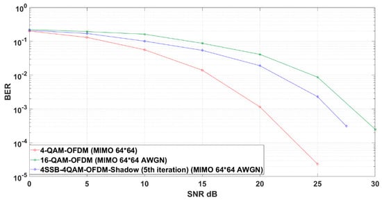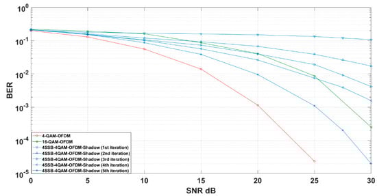 Overall, the 4-QAM 4-SSB OFDM performance can reach SNR efficiency close to equivalent amount information as of 16-QAM after the fifth iteration as verified in our prior work in 4-SSB []. However, the 4-QAM OFDM performs worse than 4-QAM 4-SSB because OFDM scheme carries less amount of bit compared to 4-SSB.