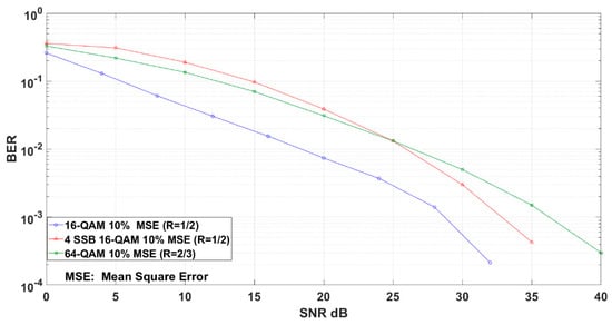 Besides, to verify the efficiency of the proposal for practical deployment, we take turbo code as a classical coding approach for the transport channel, and we fix the Mean Square Error (MSE) value as 10% for the equalizer’s channel estimation used by equalizer to model imperfect equalizer []. Specifically, in Figure 7, we compare the BER performance of different modulation schemes in the coded case using turbo code with comparable information data-rates.
