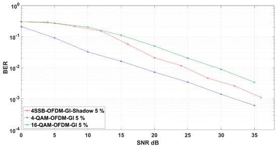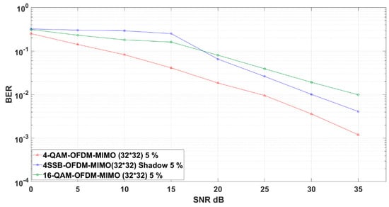 In our proposal, the 4-SSB M-QAM performs slightly close to the performance of 16 QAM over the OFDM scheme. However, the 4-SSB M-QAM with shadow equalizer decreases the SNR compared to the previous scenario as we apply both the equalization and massive MIMO. This efficiency is demonstrated after 20 dB SNR. In the other hand, the 4-QAM OFDM has good performance because it carries only two bits (Figure 8).