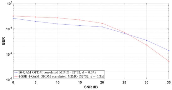 Next, we consider a more realistic MIMO scenario by showing the impact of the channel correlation. Particularly, we adopt a spatially correlated MIMO fading model using the Kronecker product model []. This model assumes the fading statistics of the transmit and receive antennas are independent. The correlation matrices are then computed based on the Bessel distribution correlation and the distance between antennas. In Figure 10, we take the distances between antennas as d = 0.3λ. As the effect of the channel correlation is examined for the uncoded case, we show that the same results can be obtained in the case of non-correlated Rayleigh channel.