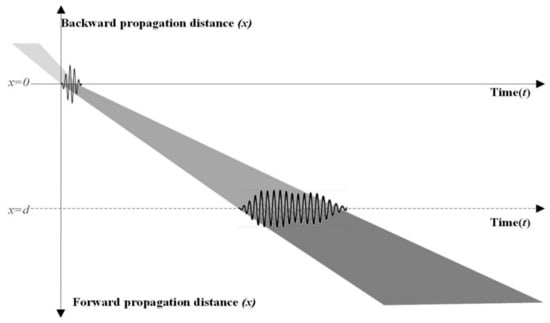 Equation (1) presents that a received guided wave signal is obtained with the propagation distance d, as shown in Figure 2. In the forward propagation direction from the origin of the coordinate, the signal is stretched continuously in time and space . The same dispersion phenomenon occurs in the backward propagation direction. Thus, in the negative propagation direction, the stretched wave packets converge towards the original excited wave before passing through the line.