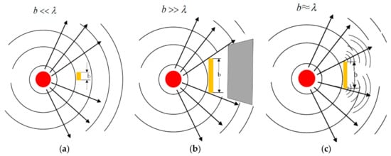 When the obstacle size is considerably smaller than the wavelength of the sound wave, the sound wave continues to propagate, similar to the situation without the obstacle. On the contrary, when the obstacle size is considerably larger than the wavelength of the sound wave, the sound wave is mainly reflected, and the area behind the obstacle remains silent. Between these situations, if the obstacle length is similar to the wavelength, then the sound wave diffracts around the obstacle and propagates to the other side of the obstacle, as shown in Figure 3.