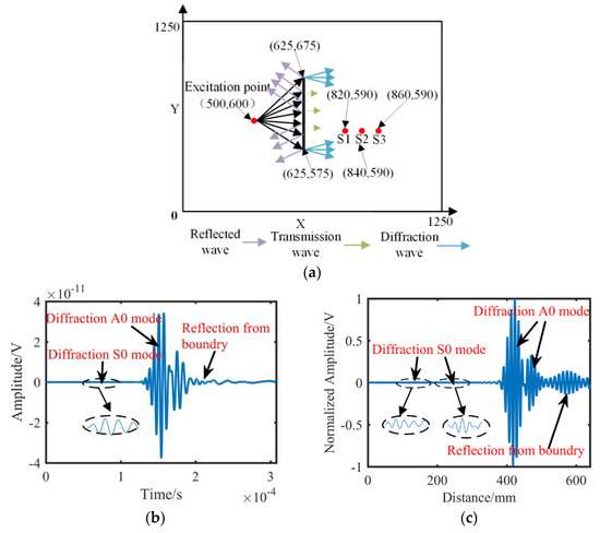 Any vibrating point in the wave field can be regarded as a sub-sound source. When the wave front encounters a fatigue crack, the sub-sound source in the crack endpoint propagates to the region behind the crack. Therefore, if a sensor array is mounted in the region behind the crack, then the diffraction wave signals are received, as shown in Figure 4a. Two diffraction wave packets from the crack endpoints are recorded by the sensor array. The received signal of each sensor contains two types of wave packets: S0 and A0 mode. However, the amplitude of S0 mode is considerably small, as shown in Figure 4b so that only the A0 wave packet is used to localize the crack. Affected by the dispersion characteristic, the diffraction wave packets expand in the time domain. Consequently, the crack imaging result based on the signals presents a reasonably low resolution. The time–distance mapping method can narrow down the stretched wave packets, as shown in Figure 4c. Therefore, the overlapped wave packets can be separated to individual wave packets. The compensated signals are beneficial for improving the imaging resolution.