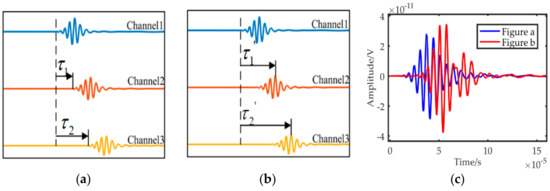 The delay-and-sum algorithm is a widely used imaging method and often based on the time domain signals. Different delay times are initially executed to signals of different channels, as shown in Figure 5a. Then, the residual signals in the time domain are summed, and the maximum value of the summed signal is regarded as the energy of the target point corresponding to the delay times. However, the wave packets of different channels have different lengths due to the dispersion characteristic. Thus, the peak value of different channels in Figure 5a will not be summed at the same time. Actually, different delay times, as shown in Figure 5b, will ensure the peak values are summed simultaneously. The summed results are shown in Figure 5c. This condition is why the conventional delay-and-sum algorithm has a certain localization error.