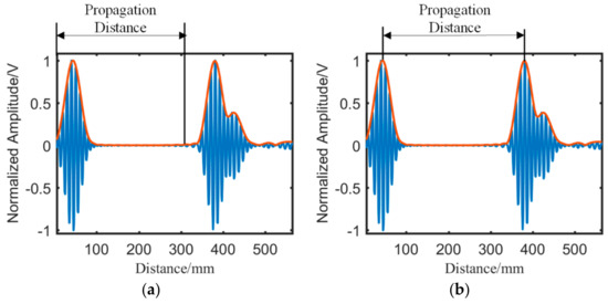 In this study, the time domain signals are initially mapped to the distance domain via the dispersion compensation algorithm. Then, the residual signals in time domain are obtained through Hilbert transform. Subsequently, the signal in the distance domain is compensated by half the length of the wave packet. On the basis of the wave propagation principle, the actual propagation distance of the wave is from the initial position of the excitation wave to the arrival point of the compensated wave (or from the excitation wave peak to the compensated wave peak), as shown in Figure 6. Therefore, the half-wave packet must be compensated in the distance domain signal. Finally, the energy of each point is obtained by an appropriate shifting rule.