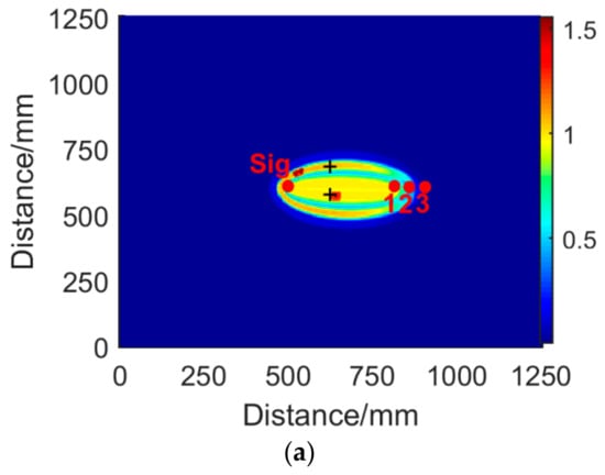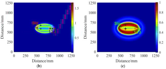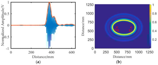 The energy of the point is defined by the relationship between the distance and the enveloped amplitude, as shown in Figure 7a. Therefore, the points with the same distance to the sensor pair have the same energy. It is known that the points with the same distance to two focus points form an ellipse. As a result, the ellipse energy field is established with the sensor pair as the focus points, as shown in Figure 7b. Moreover, the ellipse appears as an elliptical band with a certain width, and the width of the ellipse is relative to the length of the wave packet. Thanks to the dispersion compensation, the wave packet is compressed to a considerably small one, which ensures the elliptical band is reasonable narrow.