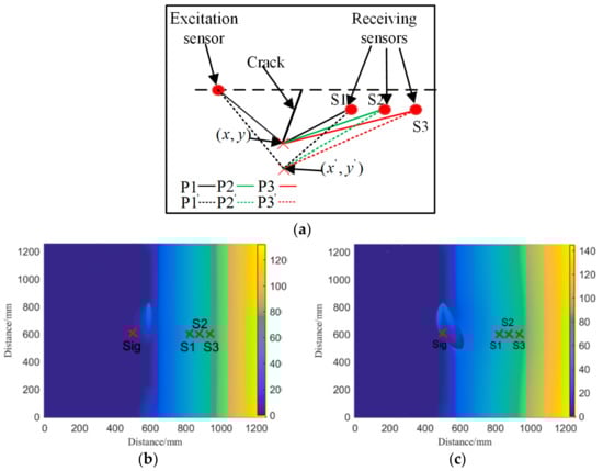 It is assumed that the lower endpoint of the crack is localized at (x, y), and the wave path distance from the excitation sensor to the receiving sensor S1, passing by the endpoint of crack, is denoted by P1. In the same manner, the wave path distance for S2 and S3 is denoted by P2 and P3 respectively. If each sensor channel is affected by the same disturbance factors, which cause the propagation distance to change, the distance of each wave path is P1 + ΔP, P2 + ΔP, and P3 + ΔP. As a result, the localization result of the proposed method is denoted by (x’, y’). Then, the localization error for the actual crack endpoint (x, y) is