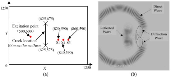 An actuator and three sensors were mounted using coupling agent on the surface of the plate-like model, as shown in Figure 10a. The positions of the excitation sensor and the receiving sensors are indicated by red points, and “×” represents the endpoint of a crack. To avoid the influence of reflected waves from the model boundaries, the elements of the model boundaries were set as infinite element type (CIN3D8). Figure 10b shows a simulation displacement field of wave motion, in which the reflection, diffraction, and direction arrival waves can be easily found.