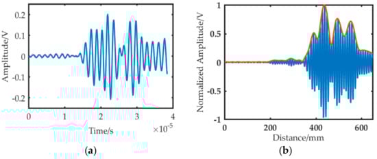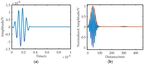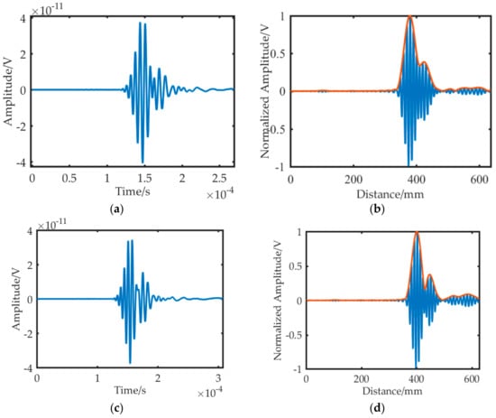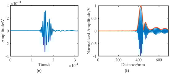 The dispersion compensation was applied to the excitation signal, mapping the time domain excitation signal to the distance domain, as shown in Figure 11b. Then, the value of half the wave packet length was calculated, which can be used for the compensation of the distance signal.