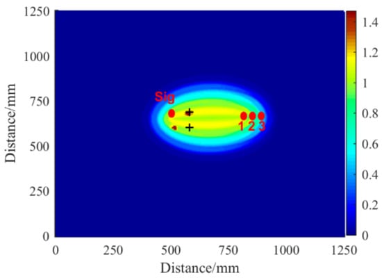 The compensated signals were used to localize the crack. Each sensor pair produces an energy field, and the average of all energy fields was obtained to present the imaging result. The maximum values represent the endpoints of the target crack, and the symbol “+” denotes the actual crack endpoints, as shown in Figure 16a. In comparison, Figure 16b presents the imaging result when the half-wave compensation was not involved. The localized endpoints were far from the actual endpoints. Figure 16c shows the image based on the conventional delay-and-sum algorithm, in which the dispersion effect was not compensated. The endpoints were blurred and combined.