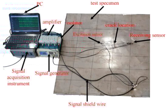 The frequency response band of the RS-2A sensor was 50 kHz–400 kHz with a central frequency of 150 kHz. The dimension of the RS-2A sensor was 18.8 mm in diameter and 15 mm in height. The relative dielectric constant of the RS-2A sensor in the z direction was far larger than that in the x and y directions, and the relative dielectric constants in the x and y directions were approximately equal to 0. The sensors were adhered to the surface of the specimen by coupling agent, among which the sensor on the left was considered the exciter and the remaining sensors are the receivers. The excitation signal was a narrowband tone burst signal with an amplitude of 10 V peak-peak voltage and a center frequency of 150 kHz. The acquisition rate of the data-collecting instrument was 2.5 MHz. Figure 14 shows the connection relationship of the experimental setup.
