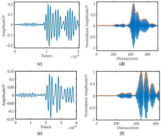 Time and distance domain signals in simulation. (a) Time-domain signal for S1. (b) Distance-domain signal for S1. (c) Time-domain signal for S2. (d) Distance-domain signal for S2. (e) Time-domain signal for S3. (f) Distance-domain signal for S3.