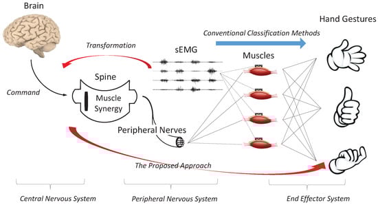 Human hands are controlled by a hierarchical structure, as shown in Figure 1. This hierarchical structure can be divided into three systems according to their physiological properties. In the central nervous system, the movement command is generated from the brain to the spine. In the peripheral nervous system, the spine activates the corresponding muscles based on the command. Please note that the spine does not activate each muscle individually; instead, several muscles are activated simultaneously as a group to drive the hand to the target gesture. This mechanism of activating several muscles as a group is referred to as muscle synergy, a physiological process used by the human to control high-dimensional systems through low-dimension commands []. In the end effector system, the muscles drive the hand joints to the targeted position.