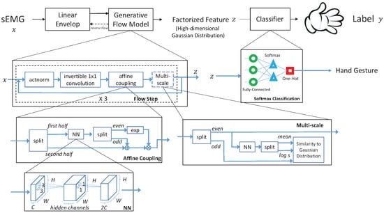 In this paper, a generative flow model (GFM) is used with a simple SoftMax classifier for hand-gesture classification. GFM is an unsupervised model commonly used for generating images [] and synthesizing speeches []. In these cases, attention has been paid to the performance of the GFM in generating realistic samples, such as images and speeches. However, we focused on understanding the factorized features learned by the GFM and applying the learned features for supervised tasks. The combination of the GFM with a linear SoftMax classifier has achieved high accuracy in sEMG-based hand-gesture classification. In addition, the features learned by the GFM under the regulation of the SoftMax classifier have physiological relevance to the muscle synergy, which is important for comprehending the classification. The proposed approach achieved accuracy in classifying 53 different hand gestures from the NinaPro database 5 []. Since the high-level feature learned by the GFM is factorized, each dimension of the feature was analyzed individually using the reverse flow of the GFM. Interestingly, each dimension of the learned feature was found to correspond to a basic sEMG pattern that may reflect human muscle synergy in the sEMG.
