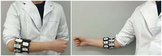 To test the performance of the proposed approach in hand-gesture classification, the proposed model is trained with the NinaPro database 5, which contains sEMG recorded with two Myo armbands. sEMG from the Myo armbands are sampled at a rate of 200 Hz. The two Myo armbands, each including 8 active single differential wireless electrodes, are placed next to each other, as shown in Figure 4. The top Myo armband is placed close to the elbow with the first sensor placed on the radio humeral joint; the second Myo armband is placed just after the first, near the hand, and is tilted by 22.5 degrees with respect to the first Myo armband. Database 5 includes 6 repetitions of 53 different movements (shown in the Appendix A) performed by 10 intact subjects. Please note that the number of sEMG examples for hand rest is much larger compared to the other movements, and we randomly sampled some of the rest sEMG examples to guarantee a balance in the sEMG examples for different hand gestures.