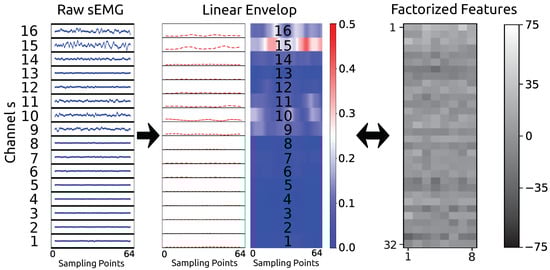 The raw sEMG data were transformed into factorized features, as shown in Figure 5, using the linear envelope pipeline and GFM. Please note that the transformation between the linear envelope and the factorized feature is invertible.