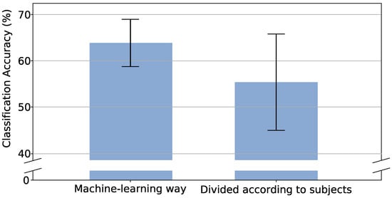 As shown in Figure 6, the classification accuracy of the proposed approach on the test set divided according to subjects is . In addition, the classification accuracy of the proposed approach on the test set divided in the machine-way, where sEMG examples of the test set are randomly selected from the NinaPro database 5, is . The proposed approach, as expected, performs worse on the test set divided according to subjects than the test set divided in the machine-learning way. This performance reduction is caused by the approach lacking enough knowledge about the sEMG examples of a specific subject. However, the reduction is only , which means that the proposed approach has learned some common features across subjects.