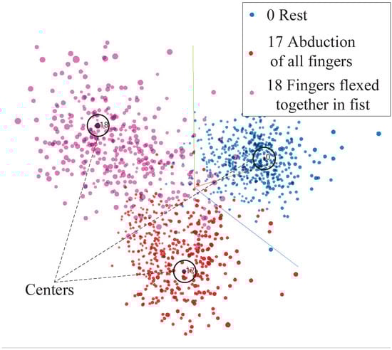 Distributions of hand rest, hand open, and hand close in the feature space. Total variance described: 24.5%