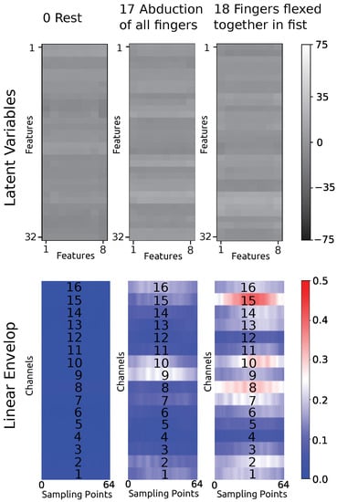 The typical features of the three hand gestures are transformed by the reverse flow of the GFM to the corresponding sEMG linear envelope. Features and the transformed sEMG linear envelope corresponding to hand gesture 0 (rest), 17 (abduction of all fingers), and 18 (fingers flexed together in fist) are shown in Figure 8. We can see that the typical feature of rest is transformed to a zero sEMG linear envelope, which correlates with the rest movement. Furthermore, hand gesture 17 and 18 differ mainly in the activation of channel 8 and 15. Channel 8 and 15 cover the activity of the flexor carpi ulnaris muscle of the forearm, which acts to flex and adduct the hand. Physiologically, the activity of the flexor carpi ulnaris muscle is useful for distinguishing hand opening and hand closing.