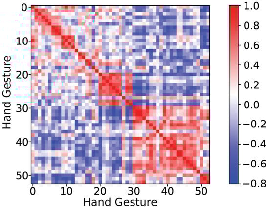 The correlation matrix is important for evaluating the ability of a generative model in distinguishing different classes. Each element of the correlation matrix is calculated as the cosine of the angle between two hand-gesture centers. A hand-gesture center can be treated as a vector connecting the origin of coordinates to the center. The cosine of the angle between two vectors evaluates their correlations. The correlation matrix of the proposed approach is shown in Figure 9. If the correlation between two hand-gesture centers is close to 1, then the two hand gestures are hard to distinguish from each other.