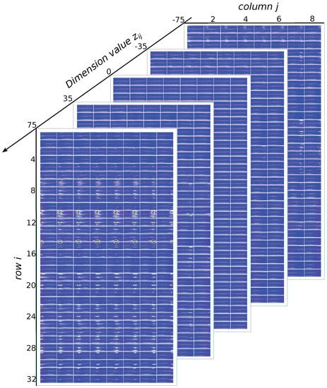 Since the feature learned by the GFM is factorized, each dimension of the feature is analyzed individually to evaluate its relation to the sEMG linear envelope. Figure 10 shows sub-images arranged along the axis of dimension value z in 32 rows and 8 columns in which the sub-image at row a and column b is generated by a factorized feature with . The dimension value v is constrained in because is the minimum/maximum value of the feature obtained in the train set, and a dimension with value >75 or <−75 is the output of the reasonable range of the feature. In Figure 10, generated sEMG linear envelopes corresponding to some selected v values are shown. From the results, we can see that v determines the strength of the generated sEMG linear envelope, and the strength of the sEMG linear envelope increases with increasing v. We can also determine that each row of the factorized feature corresponds to a basic pattern of the sEMG linear envelope, which may reflect the muscle synergy taking effect underneath the sEMG recording channels. Each column of the feature corresponds to the spreading of the basic pattern with time. For example, the 11th row corresponds to a pattern of the sEMG linear envelope, where channels 16, 15, 12, 11, 10, and 4 are activated simultaneously, and the columns determine the occurrence time of the pattern. At the first column, the pattern occurs on the left side of the sub-image, while at the column, the pattern occurs at the right side of the sub-image. The left/right side of the sub-image corresponds to the occurrence of a pattern in the sEMG linear envelope. In summary, the factorized feature is interpreted as follows: the 32 rows determine 32 different sEMG linear envelope patterns, the 8 columns determine the occurrence of the patterns in the sEMG linear envelope, and the elements of the matrix determine the strength of the sEMG linear envelope.