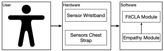 - Software: This group is formed by all the software modules in charge of calculating information and using this information to create and/or adapt the exercise sequence of a user according to his user profile and dynamic evolution. These modules are: Empathy Module according to the sensor information, calculates the current user’s emotion; and the FitCLA which calculates the proper exercises sequence or adapts the current one according not only to the user profile, but also his current physical and emotional stress.