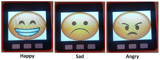 To display emotions, the virtual assistant (embedded inside the M5stack) is able to project images, called faces, that convey human-like emotions. The objective is to facilitate the interaction with the users. An example of the faces can be seen in Figure 5.
