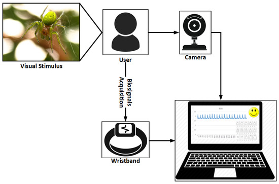One of the problems encountered is directly related to the generalization of the model, which allows us to detect emotion for any person. To try to make this generalization, an experiment was developed in which a group of individuals were subjected to different visual and auditory stimuli. During this process, four data sets were extracted. The first one comprises the personality, the emotion detected through a webcam, different bio-signals and the emotion that the user felt before each stimulus. The personality was extracted using the OCEAN test [39]. This test allowed us to group the subjects by their personalities. The second parameter set was formed by the emotions that the users expressed through the variations of their faces, when they were submitted to the stimuli. The third data set relates to the bio-signals (ECG, PPG, EDA) that were acquired during the stimulus. Finally, a subjective input, which was obtained through the SAM (Self-Assessment Manikin) test [40]. In this test, the user expressed the emotion he felt when the stimulus presented. This process can be seen in the following Figure 6. In order to obtain generalized models of emotion detection, a total of 150 people were used in a residence in the north of Portugal.