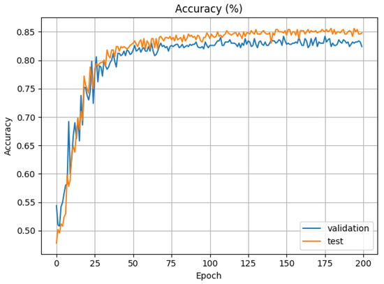 CNN accuracy in test and validation phases (training 80%, test 10%, validation 10%).
